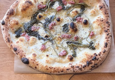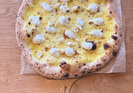 Sos z pomidorów pelati, mozzarella fior di latte, oliwa extra vergine, chips z grana padano, ser gorgonzola d.O.P, ser mascarpone, pieprz