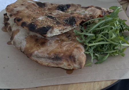 Sos z pomidorów pelati, bakłażan pieczony, mozzarella fior di latte, oliwa extra vergine, pomidory półsuszone, cebulka borretana, rukola, ser pecorino w płatkach