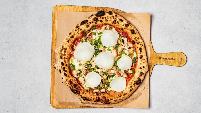 Sos z pomidorów pelati, tarte grana padano, mozzarella fior di latte, pieczarki, oliwa extra vergine, szczypiorek, kwiaty jadalne